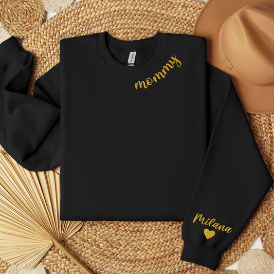 Custom Mom Sweatshirt with Kid Name on Sleeve Gold Glitter