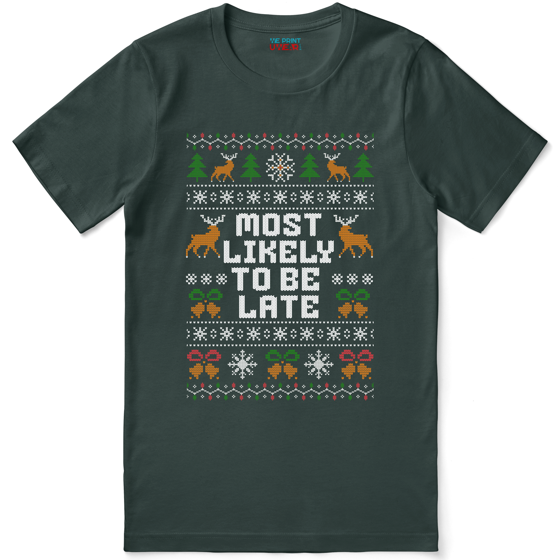 Stay cozy and sarcastic! “Most Likely To Be Late” T-Shirt is perfect for office Christmas, ugly Xmas sweater contests, and gifts for coworkers.