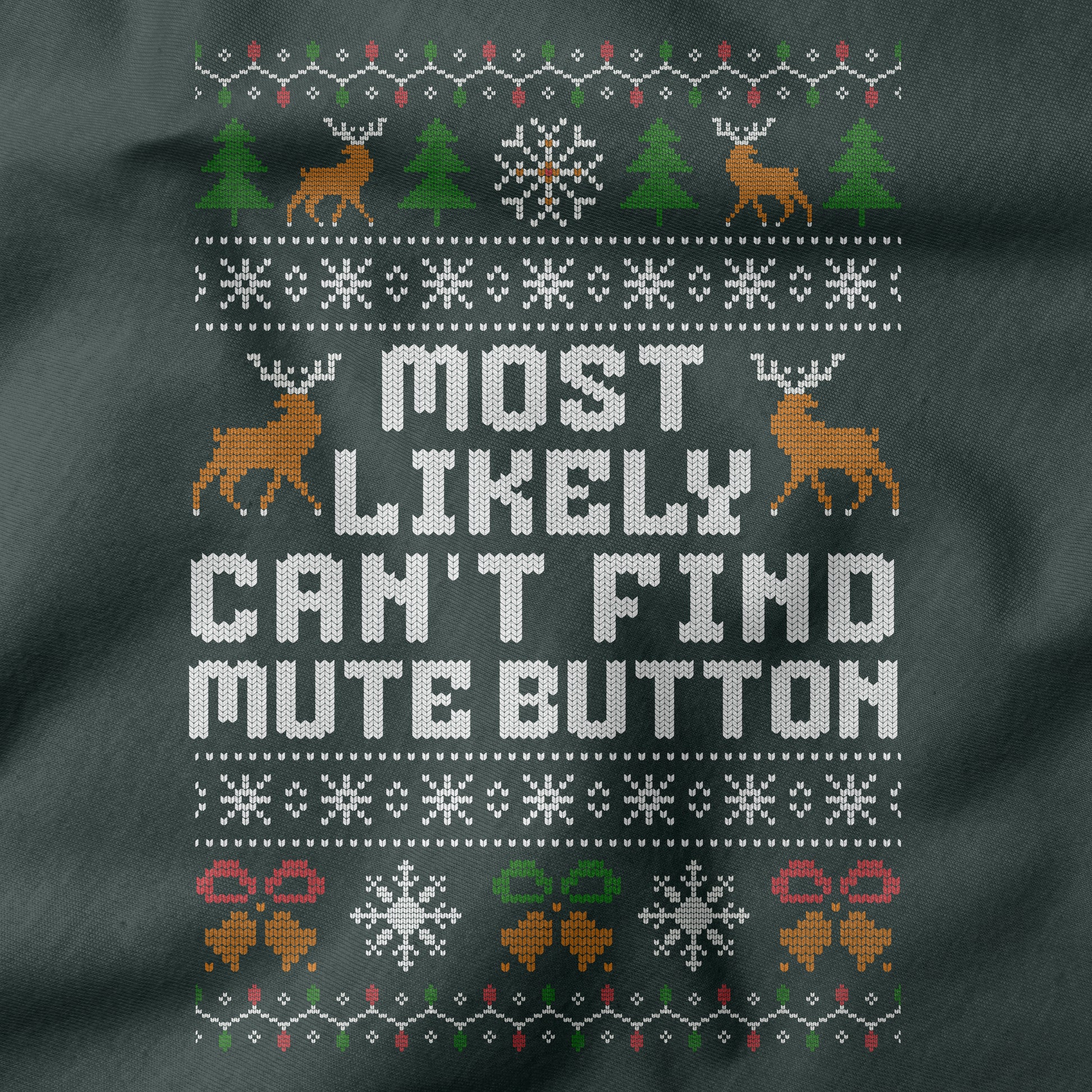 Stay sarcastic and festive! “Most Likely Can't Find Mute Button” T-Shirt is perfect for office Christmas, ugly Xmas contests, and coworker gifts.
