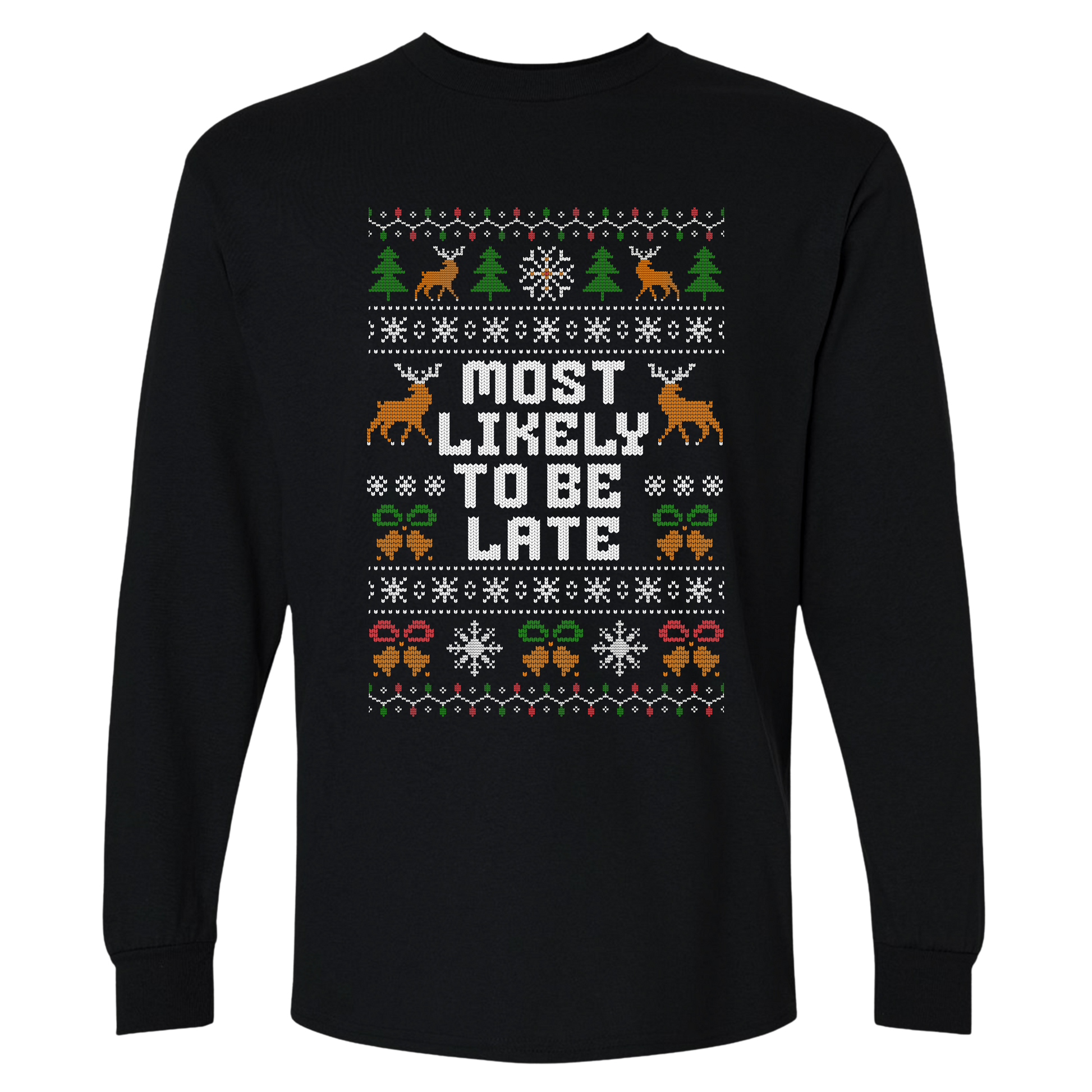 Stay cozy and sarcastic! “Most Likely To Be Late” Long Sleeve Shirt is perfect for office Christmas, ugly Xmas sweater contests, and gifts for coworkers.