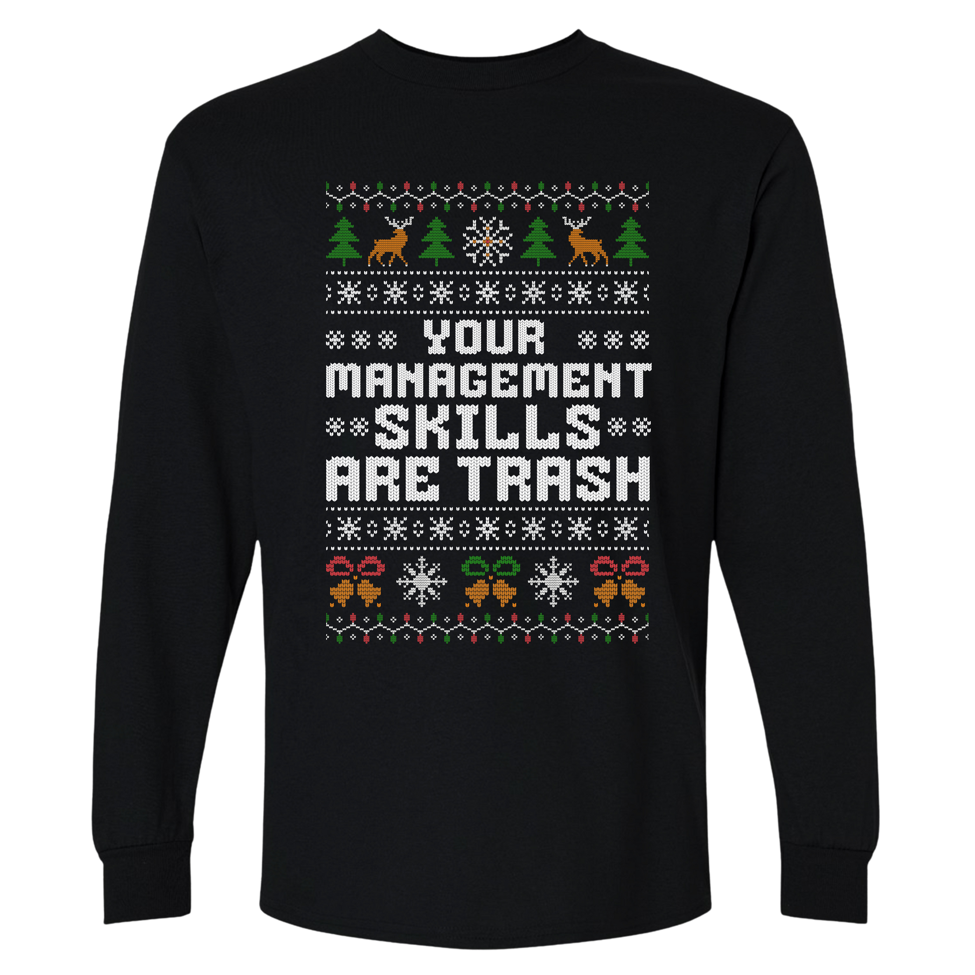 Stay cozy and sarcastic! “Your Management Skills Are Trash” Long Sleeve Shirt is perfect for office Christmas, ugly Xmas sweater contests, and gifts for coworkers.
