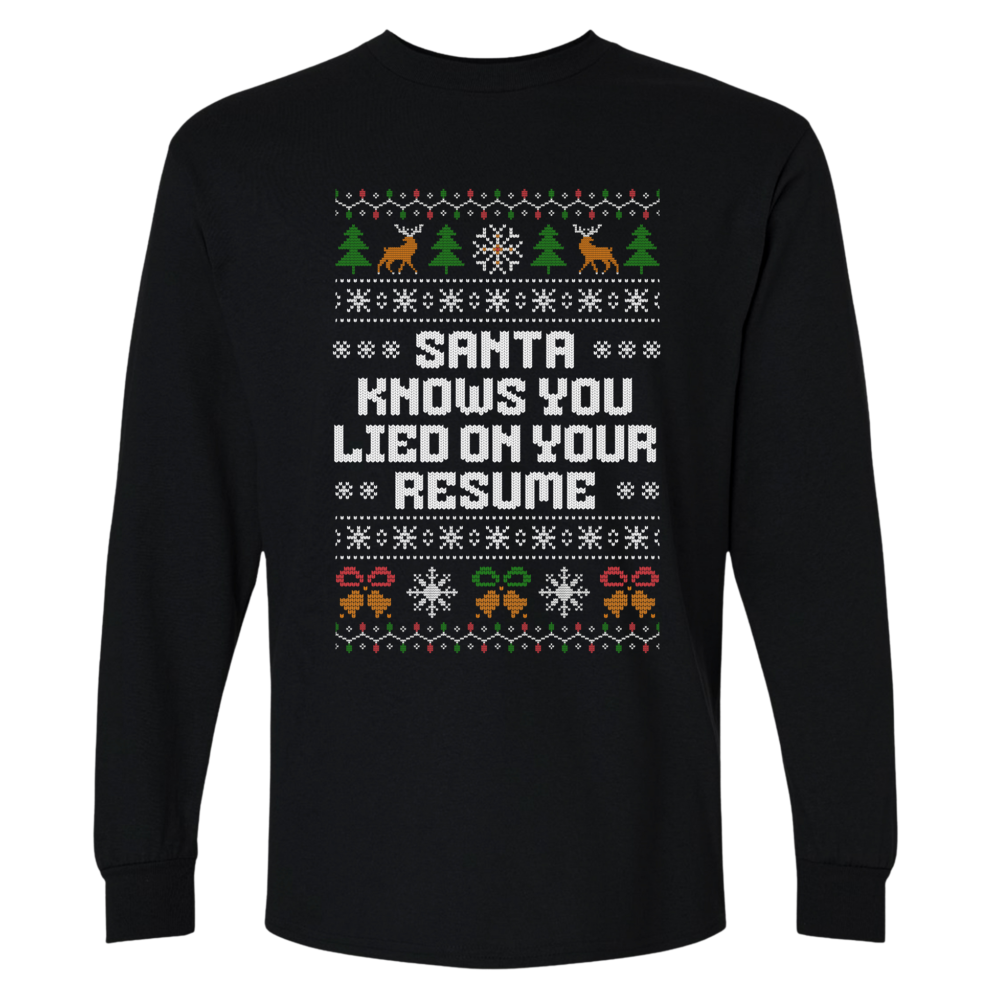 Funny Office Christmas Long Sleeve Shirt — “Santa Knows You Lied On Your Resume”